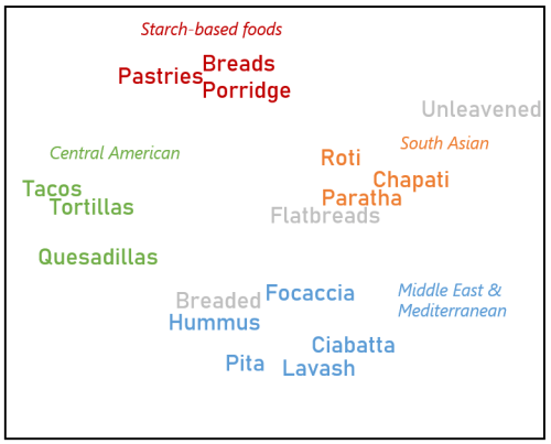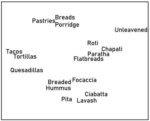 Going further, we can use similarity scores to deduce how distinct each word is relative to other words. Using these similarity scores, we can plot the words on a map, with more similar words being closer to each other. For example, the following is a word map generated by shortlisting the top 17 words most similar to Flatbread: