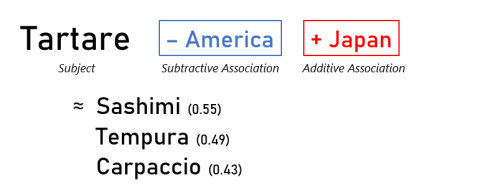 Using a word embedding model trained on approximately 6 billion words from Wikipedia and news articles, we can examine abstract relationships between food items. For example, to find the equivalent of American Tartare in Japan, we can key in this equation: